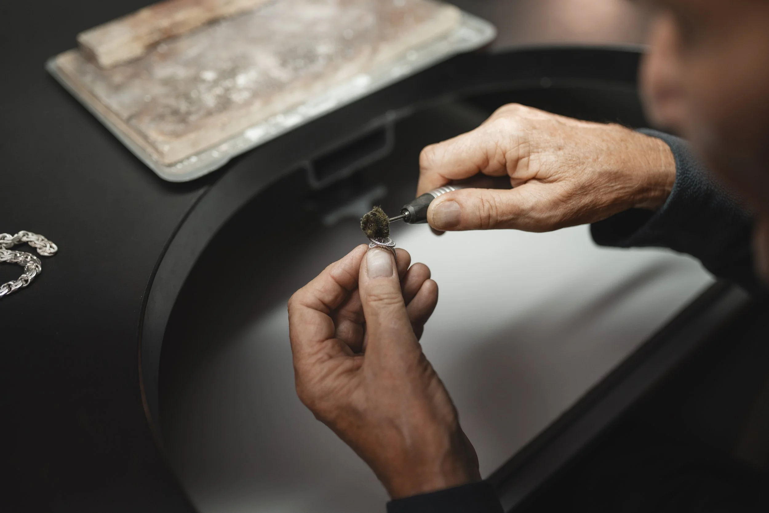 Life happens, let us help. We can replace missing stones, resize rings, repair chains, rhodium plate white gold, and much more.